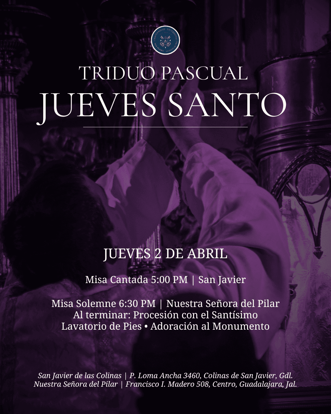 6:30 pm | Misa Solemne (Pilar), Procesión con el Santísimo, Lavatorio de Pies, Adoración al Monumento